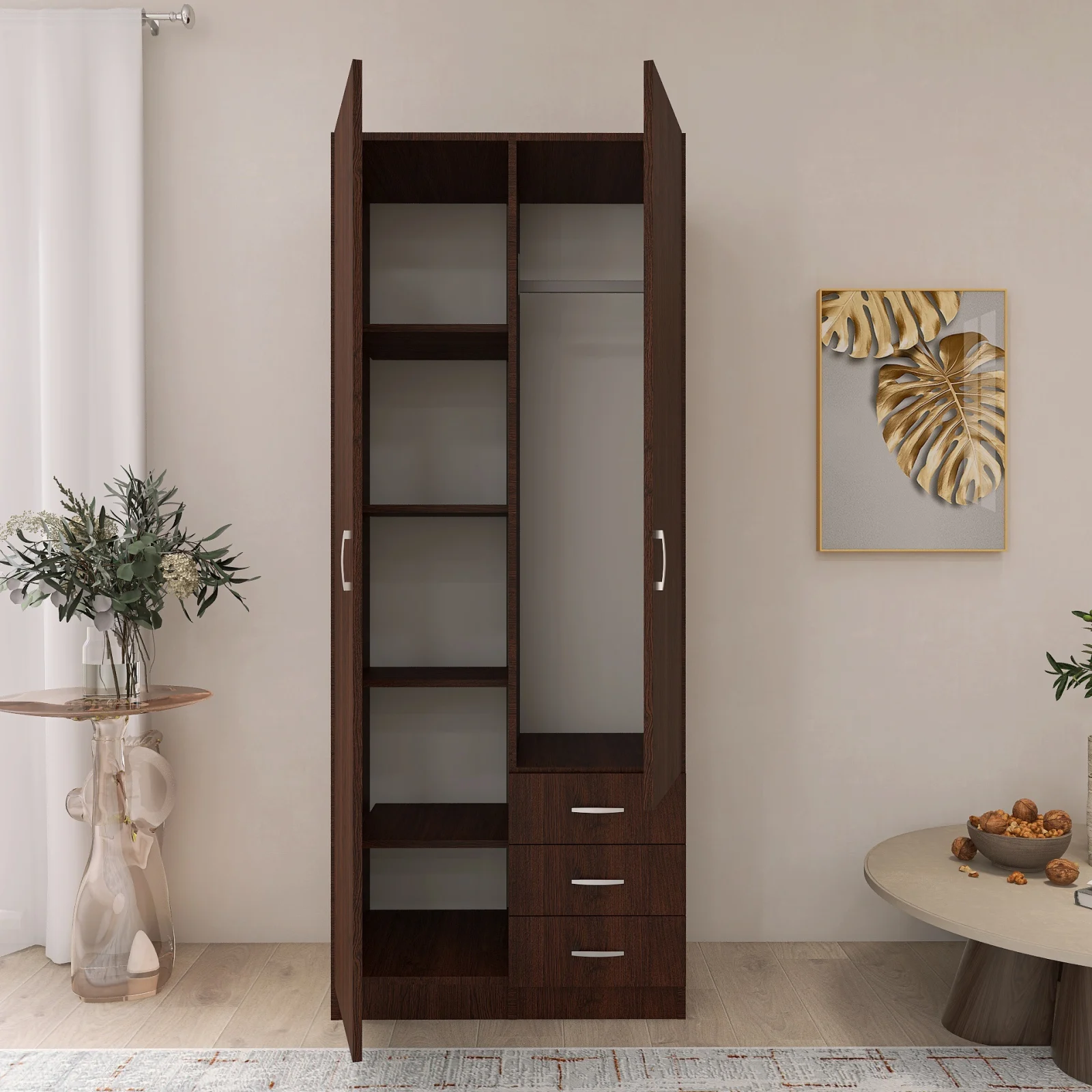 Acest dulap mixt cu 2 uși și 3 sertare spațioase este soluția ideală pentru organizarea eficientă a garderobei. Designul modern și finisajul îl fac potrivit atât pentru dormitoare mai mici, cât și pentru dressinguri generoase.