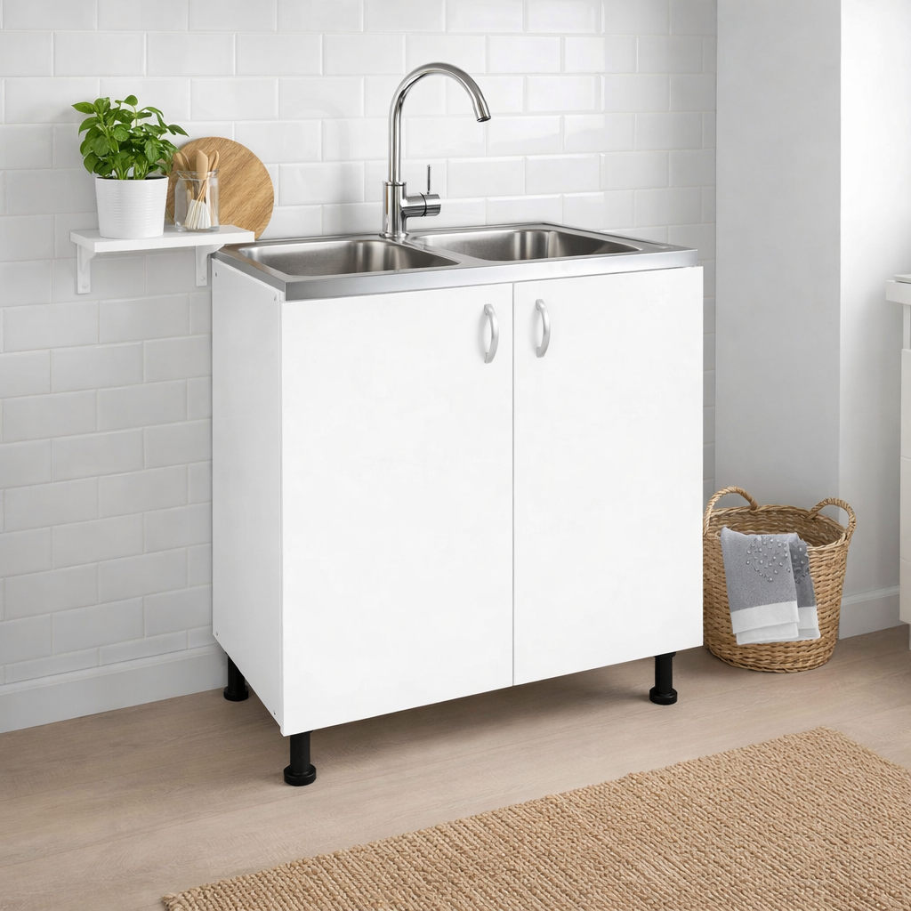 Masca pentru chiuvetă este soluția practică și estetică pentru integrarea chiuvetei în mobilierul de bucătărie. Cu un design modern și finisaj alb mat, aceasta oferă un aspect curat și organizat, ascunzând instalațiile și oferind spațiu util pentru depozitare.